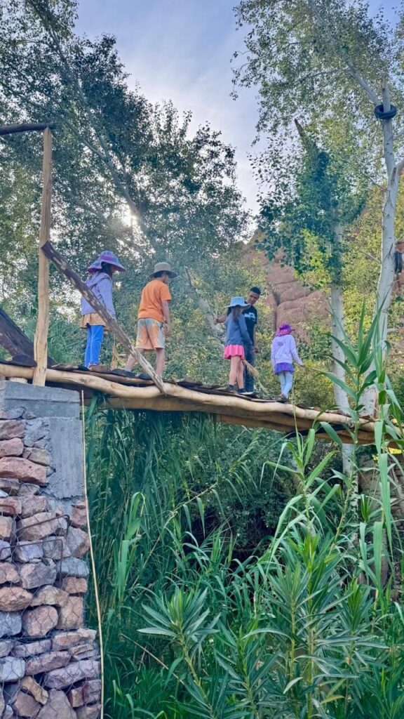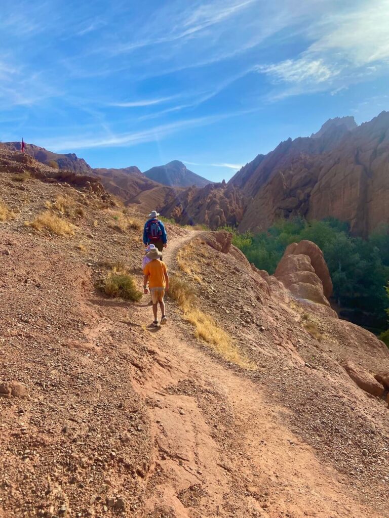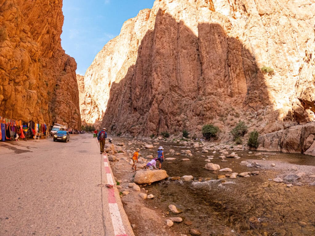 Todra Gorge is about 1-1.5 hours from Dades, toward the desert direction. It’s a more popular stop, especially for tour groups. Todra Gorge itself is a narrow gorge with dramatic towering cliffs. It is worth a stop, and the kids enjoyed wading in the river. However, we found it was way busier, with tour buses stopping in large numbers and many vendors selling souvenirs along the gorge. The main hike at Todra Gorge is a whooping 11km trek. While we obviously did not do this and cannot directly compare, the distance alone is more than what Big and Lil S can handle. (For visitors who rock climb, however, Todra Gorge is a prime climbing destination.)
