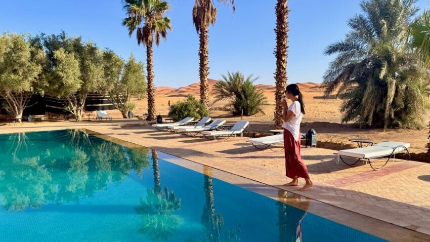 Staying in a hotel is a good option if you like to travel in comfort. You get to stay in a room that is air conditioned, clean, and comfortable. You won’t be perpetually shaking sand out of every crevice. We recommend a hotel at edge of the desert (like Kanz Erramel!) – with Sahara views and direct access to the desert. Otherwise I think we would have felt FOMO, traveling all the way to Merzouga but staying away from the desert.