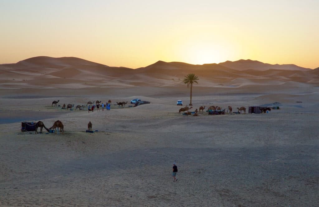 Merzouga is the most popular way to access the Sahara in Morocco. The town has a number of hotels and restaurants, and there is a plethora of desert camps and tours experiences to choose from. The alternative is M’hamid and the Erg Chigaga dunes, which is a more remote and less developed experience. The camps at Erg Chigaga can only be accessed via a 4×4.