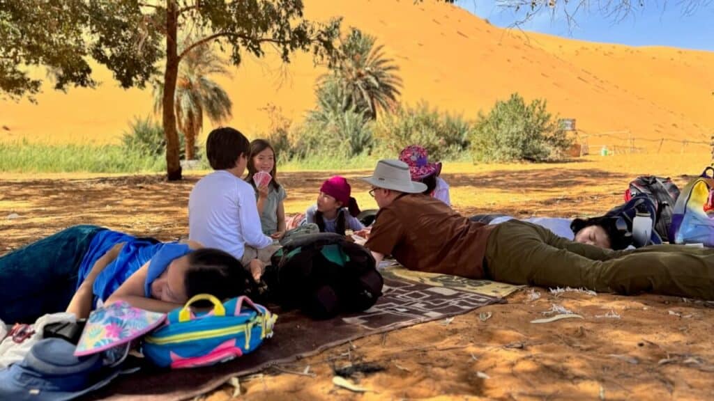 It was getting crazy hot by this time, so we all retreated to the shade of the oasis. Our guides produced yet another fantastic meal – a tuna and vegetable salad. We spent the next several hours just lounging in the shade. It might sound a little boring, but we get so little time in our day-to-day where we are forced to just do nothing together. The kids played some cards and read. We made up games with sticks and stones. We napped. We didn’t head out again for our last camel trek until around 4pm.