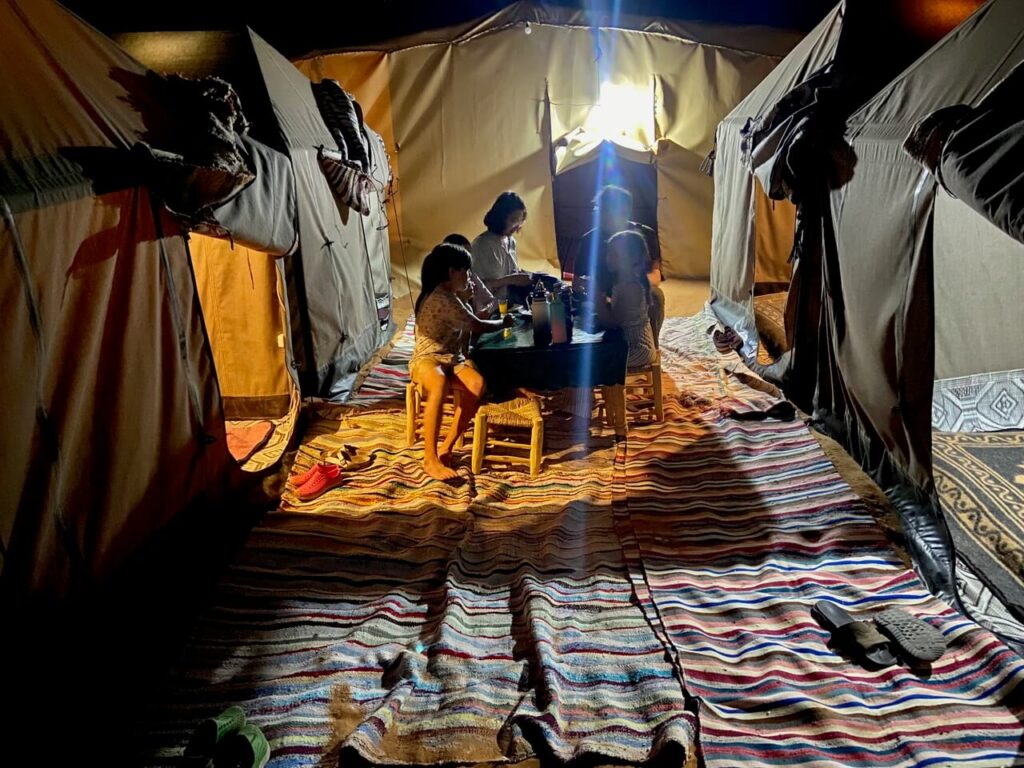 Seeing our basic “wild camp” was another surreal moment. 4 tents tucked at the base of a dune – it felt so remote we might as well have been on the moon. We had 1 sleeping tent per pair, furnished with a rug, a mattress on the ground, and blankets for everyone.