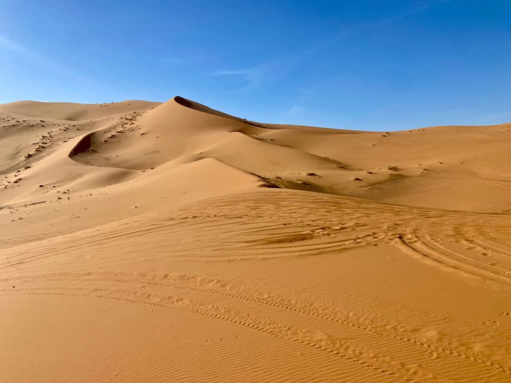 The dunes in this area were huge and so impressive, but it was still so hot, even at 4pm. Big S opted to walk for a bit as he was getting bored. We began to see tons of vehicle tracks, camel droppings, and lots of footprints, so figured we were heading back to civilization!